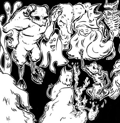 The Unhallows’ Eve was started in 2020, followin Drawtober2020 -prompts in Instagram. A story began to simmer, and it is finally ready, with the last image drawn 30th of October, 2022. It’s a simple story of demonic creatures from a dark realm, who go on celebrating their own version of Halloween. Images 1-6 were constructed and drawn first digitally, then printed and inked traditionally. The last image is all traditionally done.
